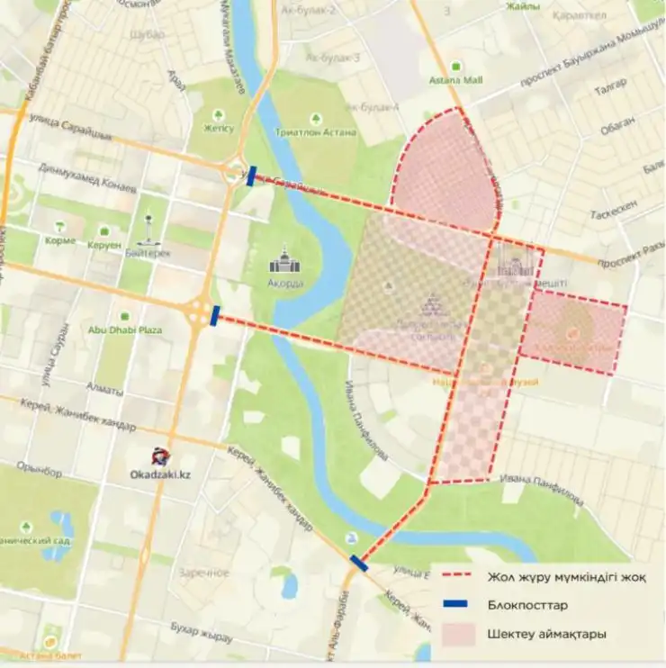С 5:00 до 13:00 закроют проспект Тәуелсіздік (от Момышулы до Панфилова) и ограничат движение на улицах Акыртас, Калдаякова и Кошкарбаева. На этих участках временно расположится военная техника.