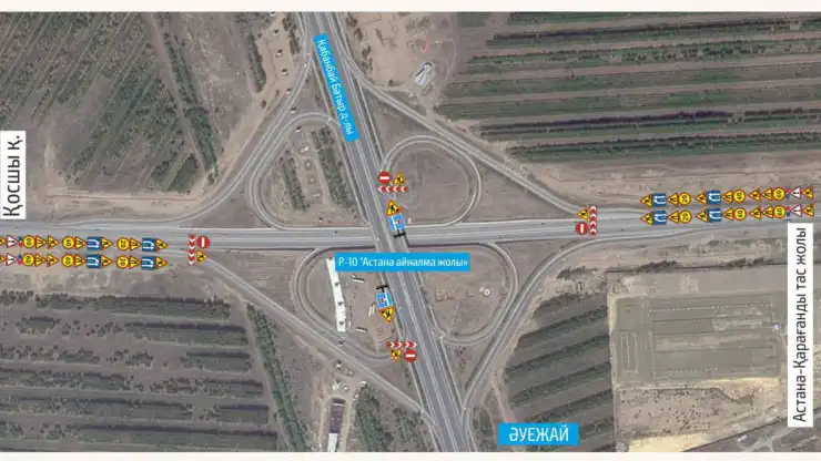 Движение будет полностью перекрыто в обоих направлениях, и транспорт перенаправят по правым съездам в сторону аэропорта и улицы Арнасай.