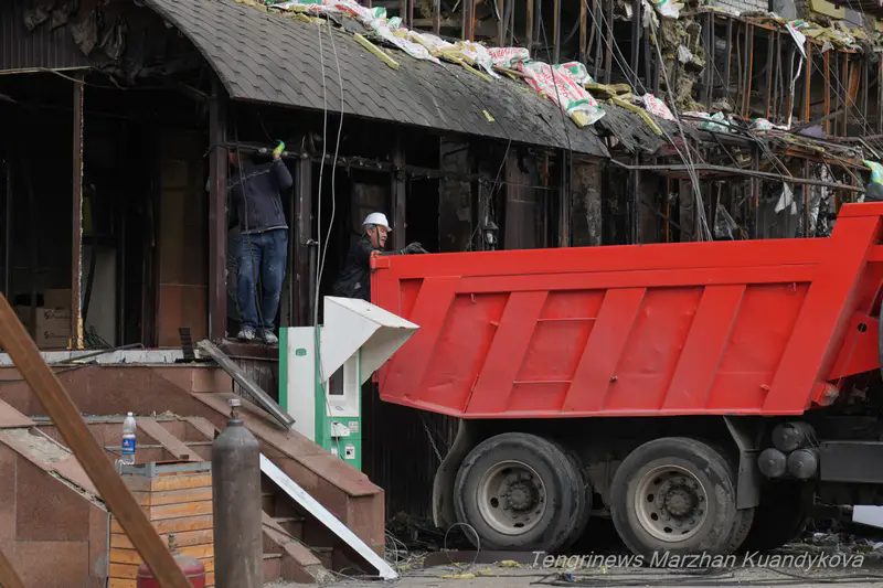 Рабочие занимаются разбором сгоревшего кафе как изнутри, так и снаружи, загружая мусор в грузовые автомобили.