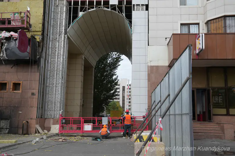Работы ведутся над фасадом здания, который пострадал больше всего. На участках, где была облицовка, теперь видны кирпичные стены.