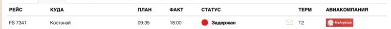 Рейс из Астаны в Костанай, запланированный на 9:35 утра, не вылетел по расписанию. Новое время вылета перенесено на 18:00, что означает, что пассажирам придется ждать более восьми часов.