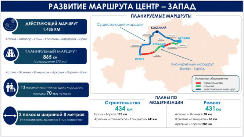 На данный момент расстояние от Астаны до западных областей составляет 1 438 километров по маршруту Астана – Атбасар – Есиль – Костанай – Карабутак – Иргиз. Новый маршрут через Жантеке, Егиндиколь, Аркалык и Торгай должен сократить путь до 865 километров, что меньше текущего варианта более чем на 560 километров.