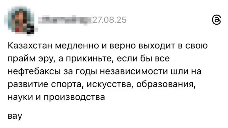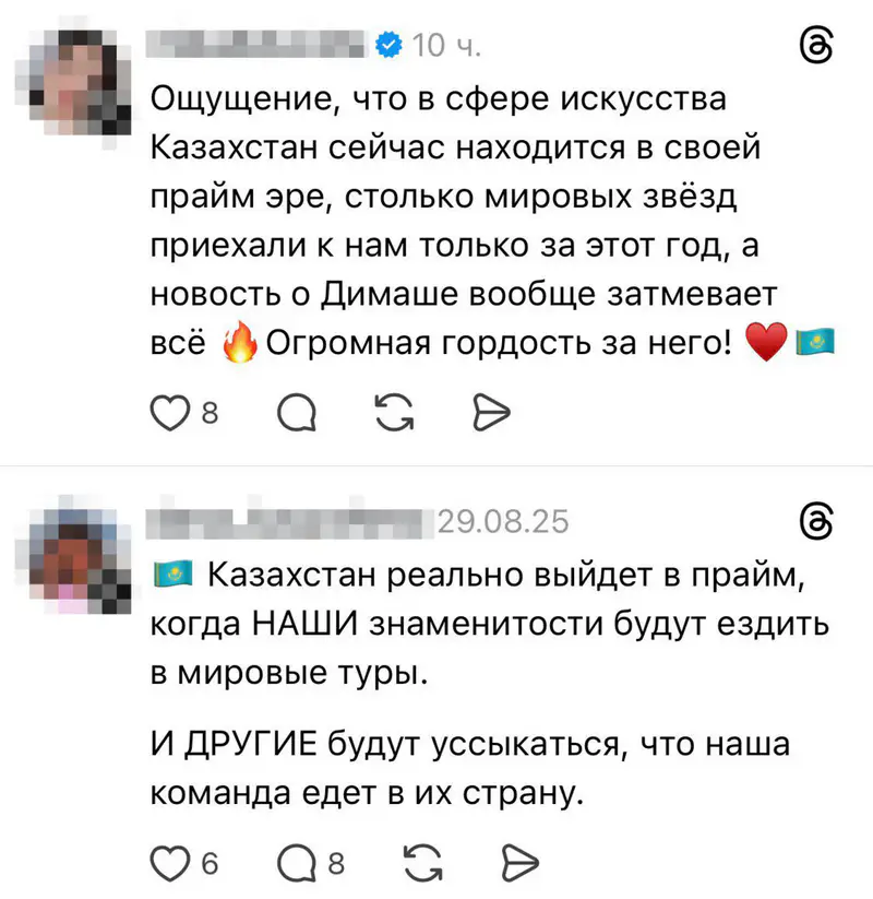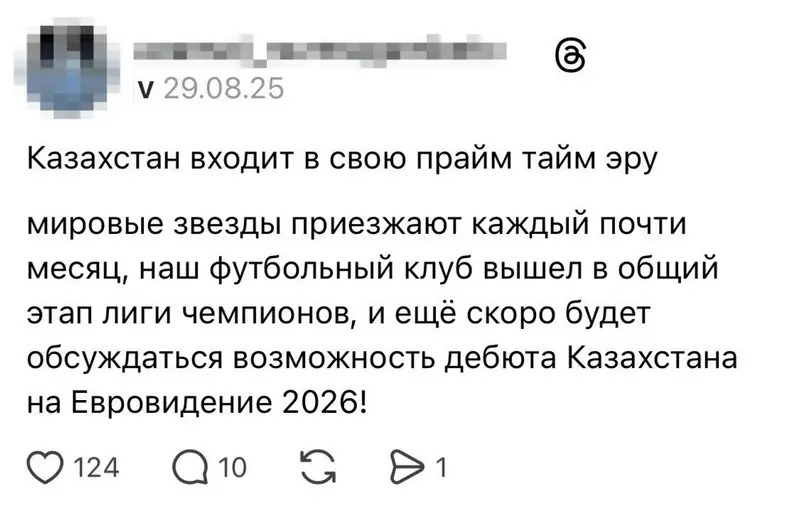 Казахстанцы в Threads продолжают активно перечислять яркие события последних месяцев, приходя к выводу, что страна переживает свою "прайм-эру". В соцсети пользователи вспоминают громкие поводы: концерты мировых звёзд, а также исторический выход футбольного клуба "Кайрат" в основной этап Лиги чемпионов.