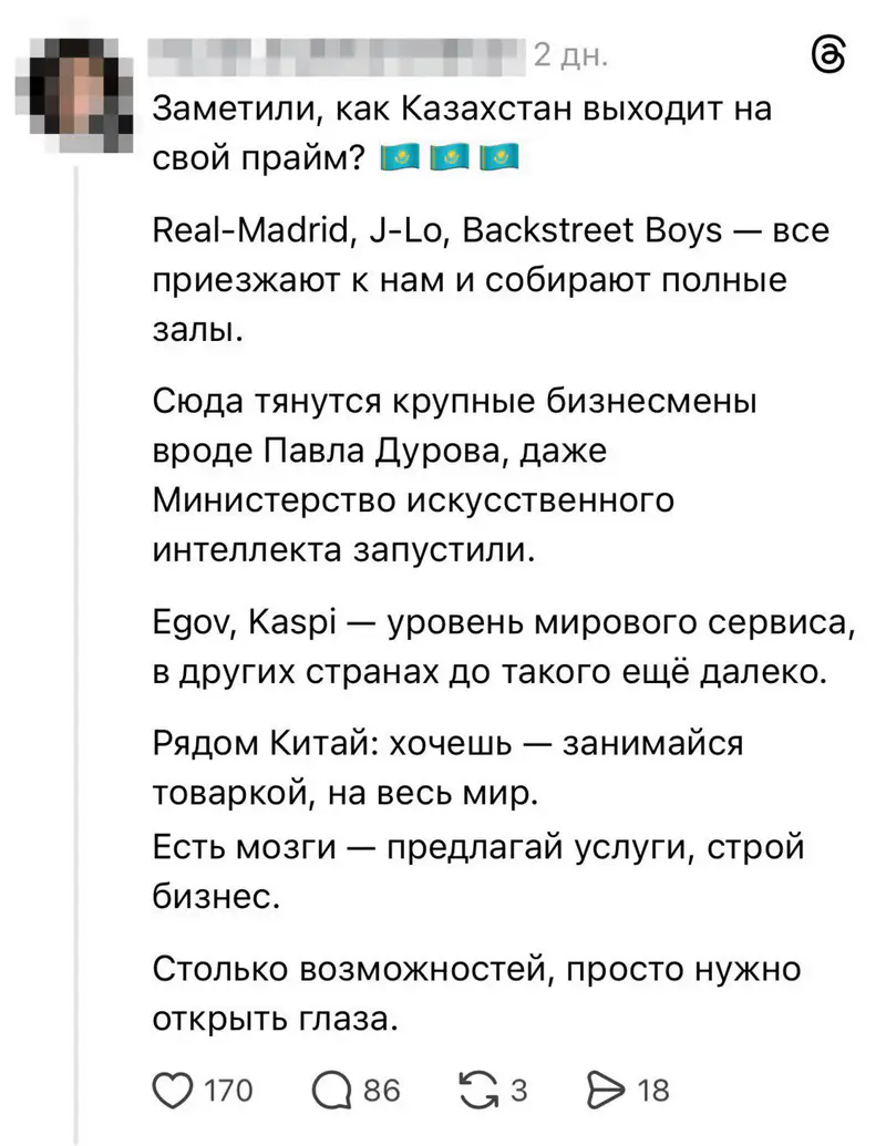 Другие пользователи считают, что сейчас Казахстан переживает время возможностей - период, когда страна постепенно становится заметнее на мировой арене, а у людей появляется больше шансов для самореализации.