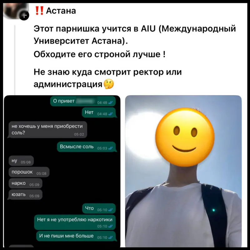 "Астана. Этот парнишка учится в AIU (Международный Университет Астана). Обходите его стороной лучше! Не знаю, куда смотрит ректор или администрация," — говорится в посте.