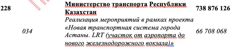 В документе указано, что на проект "Новая транспортная система города Астаны (LRT)" Министерству транспорта выделяют 66 миллиардов тенге. Эти деньги предназначены на участок линии от аэропорта до нового железнодорожного вокзала.