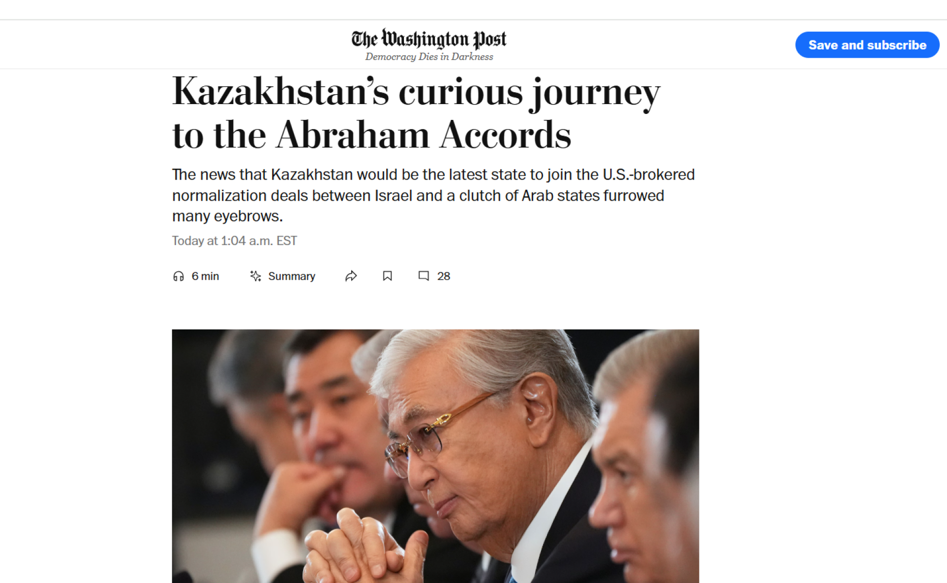 Американское издание The Washington Post опубликовало колонку журналиста Ишана Тарура, в которой анализируется решение Казахстана присоединиться к "Соглашениям Авраама". Этот шаг вызвал удивление у западных наблюдателей, так как Казахстан не имеет истории вражды с Израилем и установил с ним официальные отношения ещё в 1992 году.