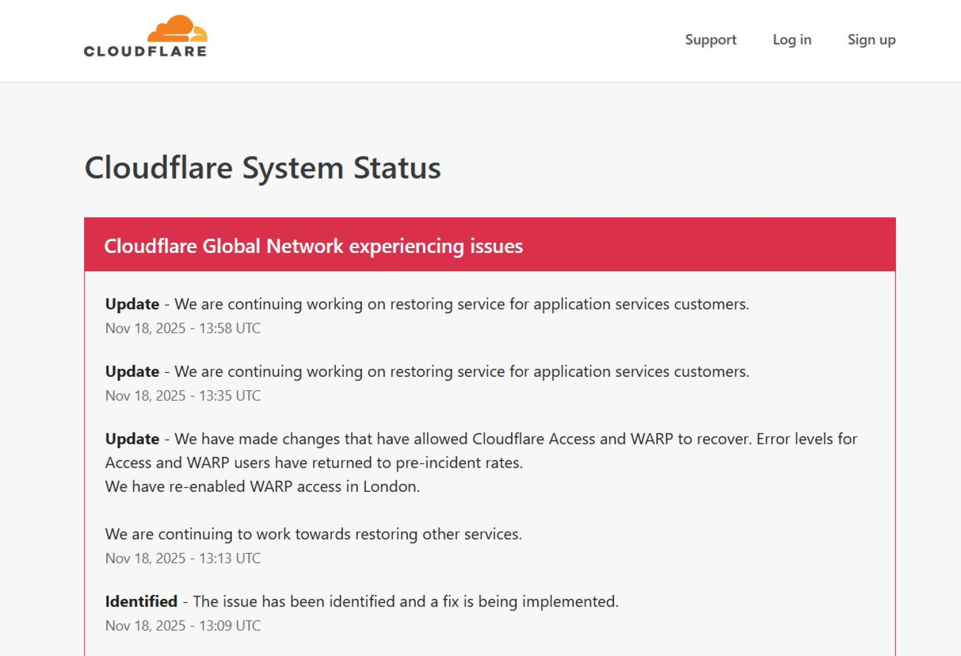 Cloudflare подтвердил, что наблюдается внутреннее снижение производительности, и они работают над восстановлением системы.