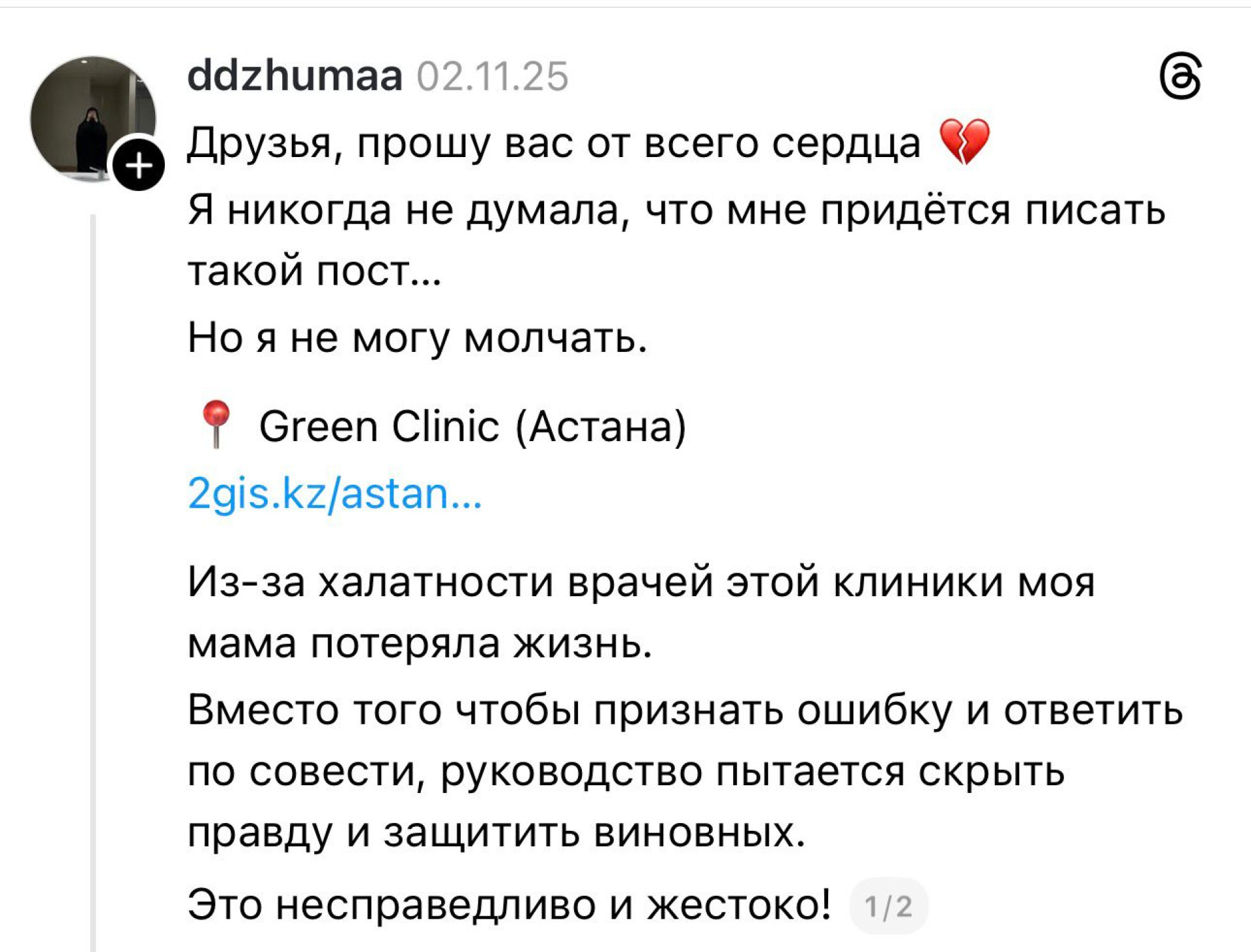 Дочь погибшей, Бейбит Джумагалиева, поделилась подробностями произошедшего на своей странице. Она рассказала о ходе операции и о том, почему семья считает, что трагедии можно было избежать.