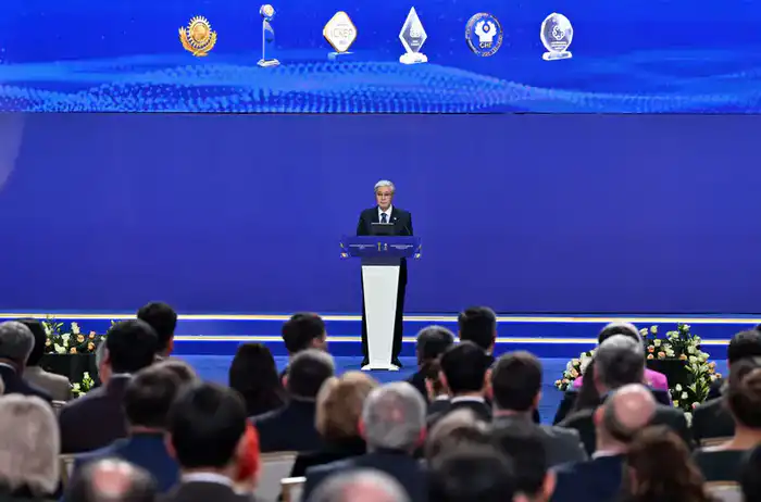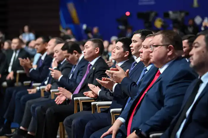 Касым-Жомарт Токаев делает небольшую паузу и смотрит в зал так, будто видит не только серьёзных людей и лакированные туфли, но и ту энергию, ради которой вообще собираются такие залы.