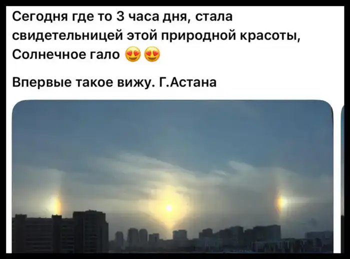 "Сегодня примерно в 15:00 я стала свидетельницей удивительного природного явления — солнечного гало. Впервые такое вижу, город Астана", — написала автор поста.