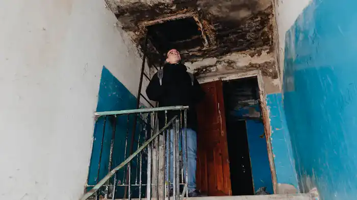 "Я даже дверь открываю в резиновых перчатках. Потому что вся эта вода течёт по потолку, стенам, по оголённым проводам. Меня так однажды током ударило, благо, соседка была рядом, спасла меня", — вспоминает Наталья.