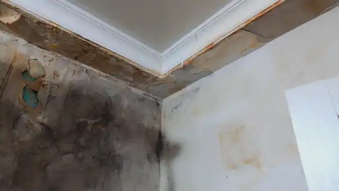 На пятом этаже мы обнаруживаем один из источников зловония — прогнивший потолок, покрытый плесенью.