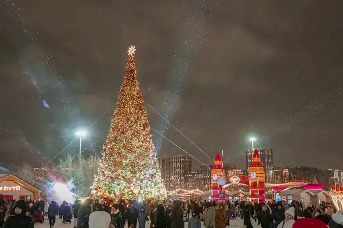 Праздничные мероприятия охватили всю столицу. В районе Нура ёлки зажглись на 11 локациях, а центральной точкой стала парковка у стадиона "Астана Арена", где установили 25-метровую ёлку.