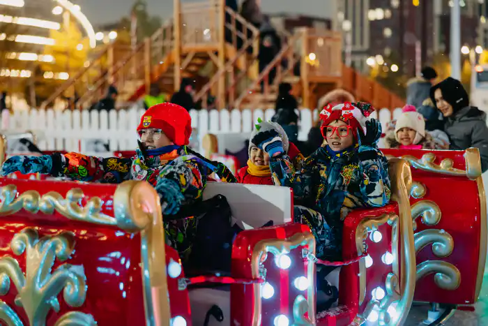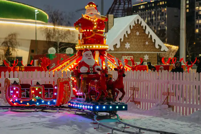 В Wonderland Astana также представлены другие новогодние аттракционы: карусель, поезд с оленями, сани Деда Мороза и дополнительные игровые зоны. Все элементы выполнены в едином визуальном стиле и гармонично вписываются в общую концепцию пространства.