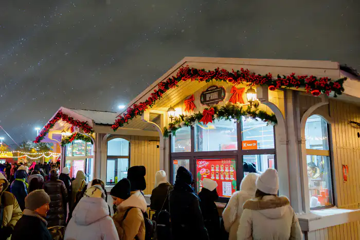 Фуд-корты расположены в центральной части городка и представляют собой теплые закрытые зоны, где можно отдохнуть и согреться между активностями. Ассортимент включает горячие напитки, выпечку и традиционные зимние угощения.