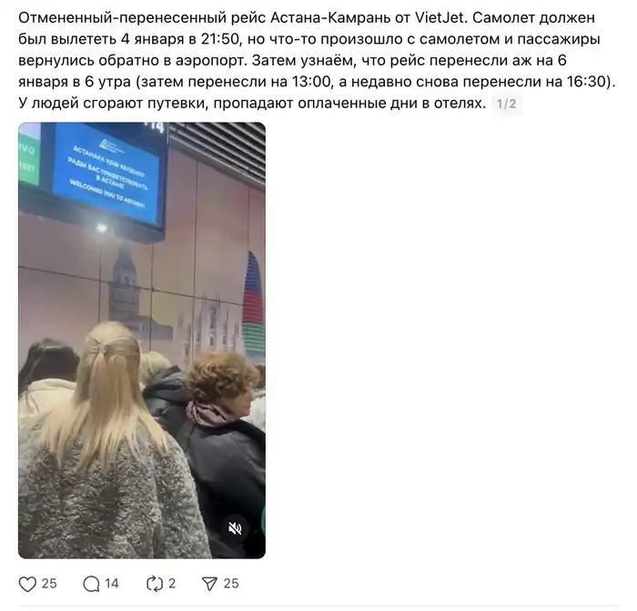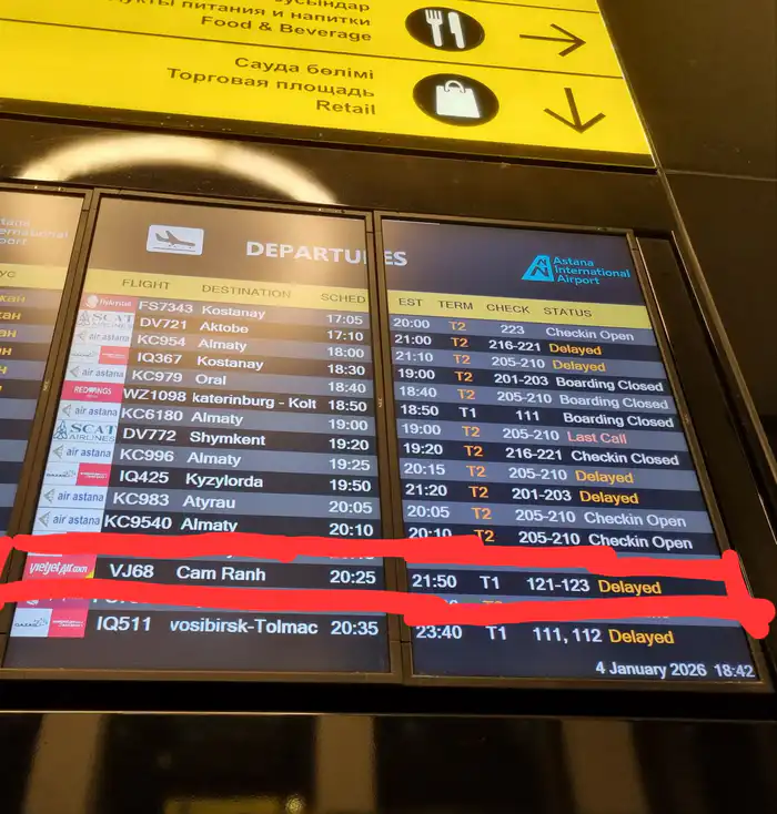 Пассажиры рейса VietJet Air из Астаны во Вьетнам ожидают вылета более 40 часов. Рейс VJ068 по маршруту Астана — Камрань должен был отправиться 4 января, но до сих пор не вылетел.