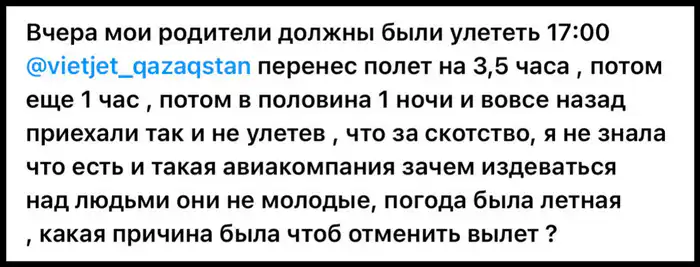 Казахстанка, чьи пожилые родители должны были лететь этим рейсом, выразила своё недовольство в социальных сетях. По её словам, рейс должен был вылететь в 17:00, однако пассажиров держали в аэропорту до полуночи. В результате, в 00:30 рейс был отменён, и её родители вернулись домой, так и не улетев.