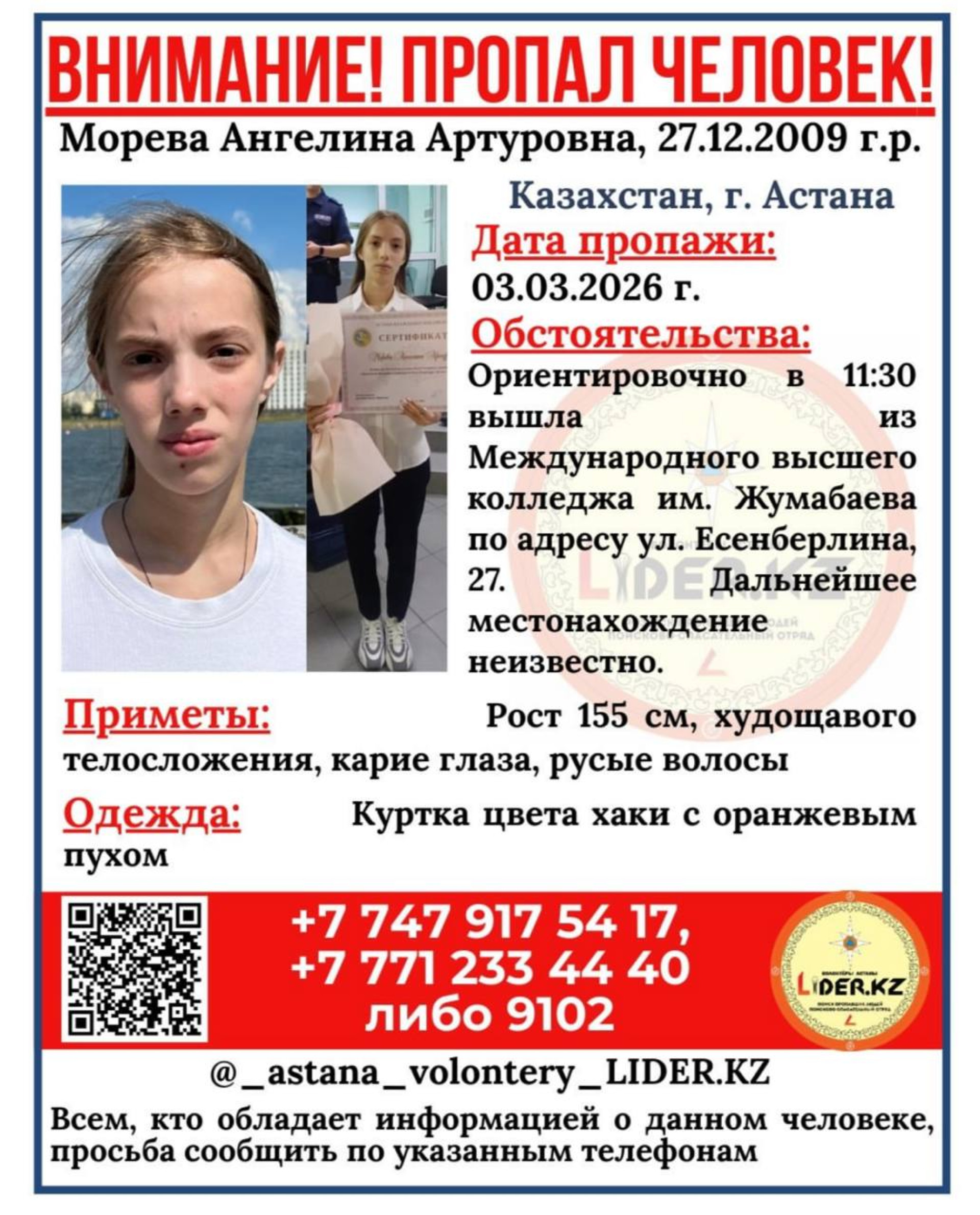 Ангелина Морева, родившаяся в 2009 году, вышла из Международного высшего колледжа имени Жумабаева, расположенного по адресу: улица Есенберлина, 27, около 11:30 и не вернулась домой. В день исчезновения она была одета в куртку цвета хаки.