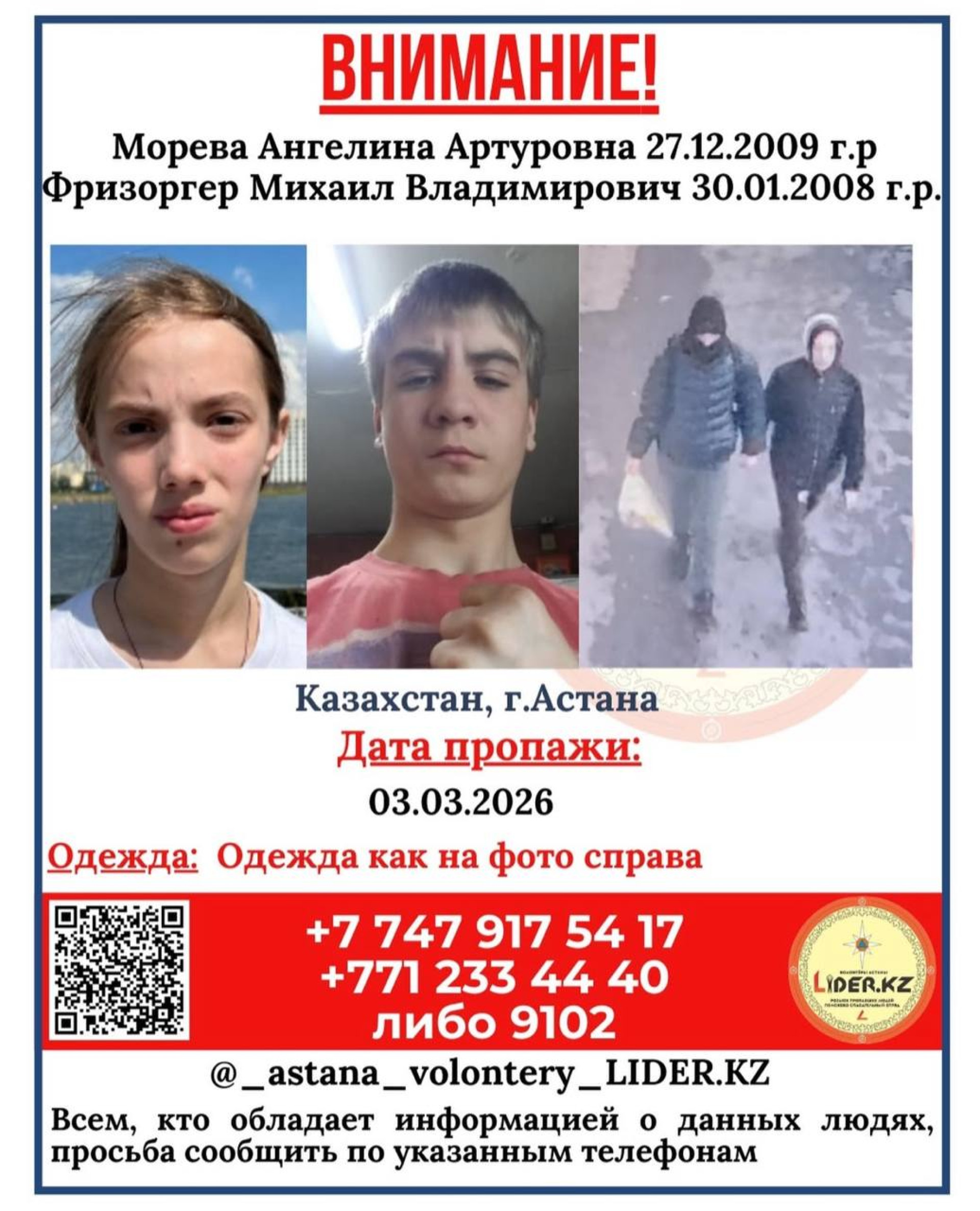В Астане продолжаются международные поиски пропавших подростков: 16-летняя Ангелина Морева и 18-летний Михаил Фризоргер исчезли 3 марта