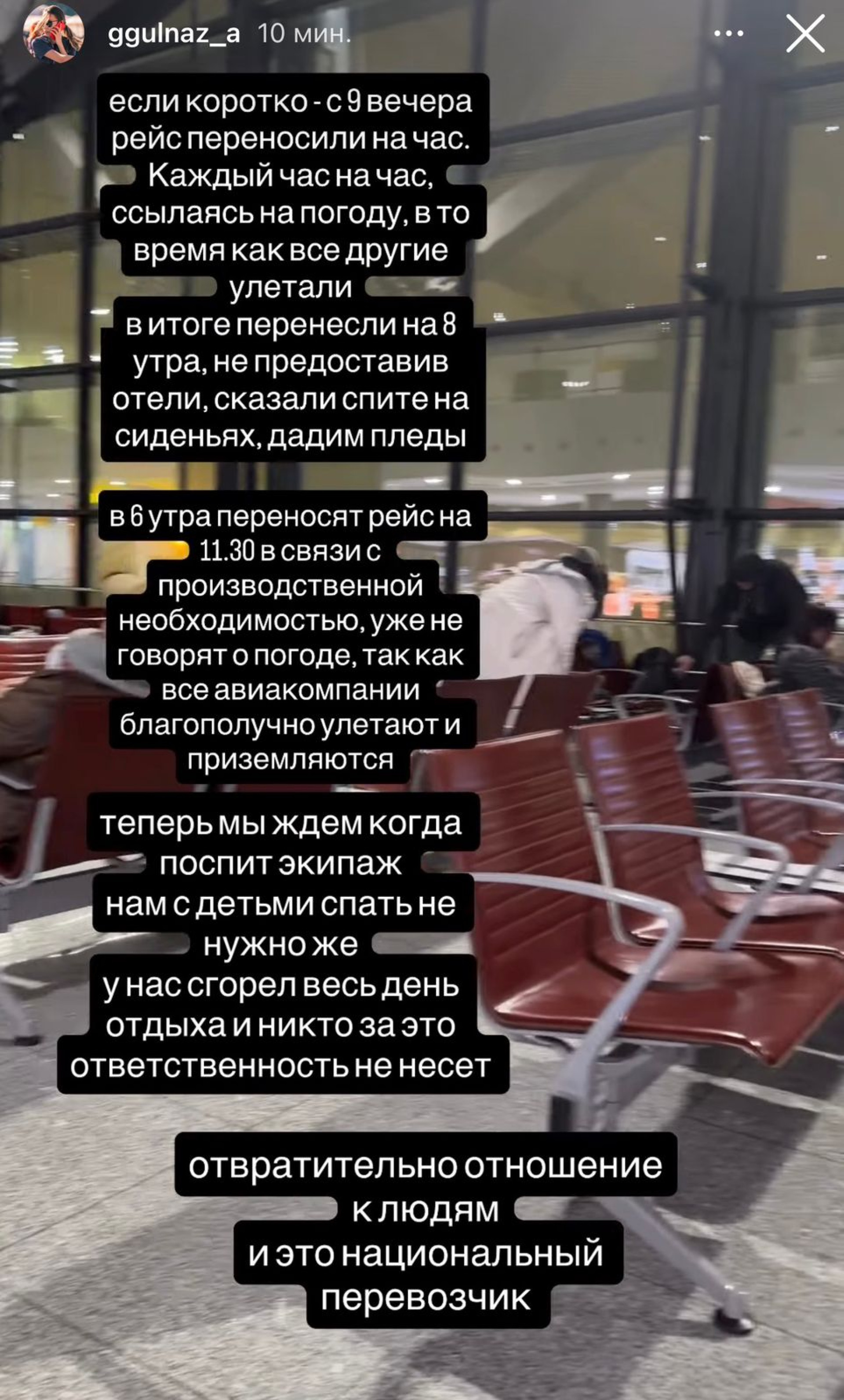Пользователь также отметил, что многие пассажиры летят транзитом через Алматы и могут не успеть на стыковочные рейсы.