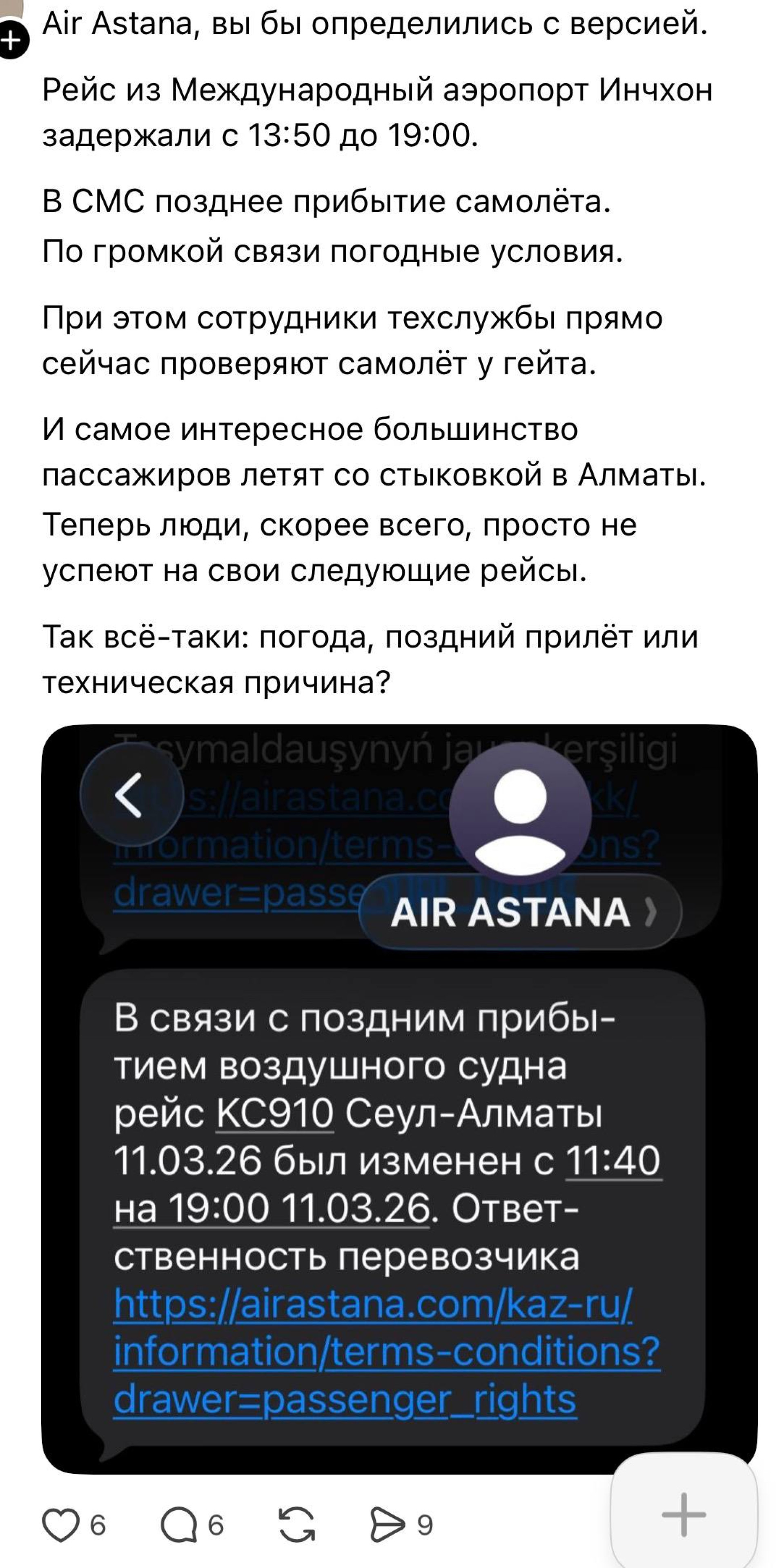 "И самое интересное: большинство пассажиров летят со стыковкой в Алматы. Теперь люди, скорее всего, просто не успеют на свои следующие рейсы. Так всё-таки: погода, поздний прилёт или техническая причина?" — задался вопросом автор публикации.