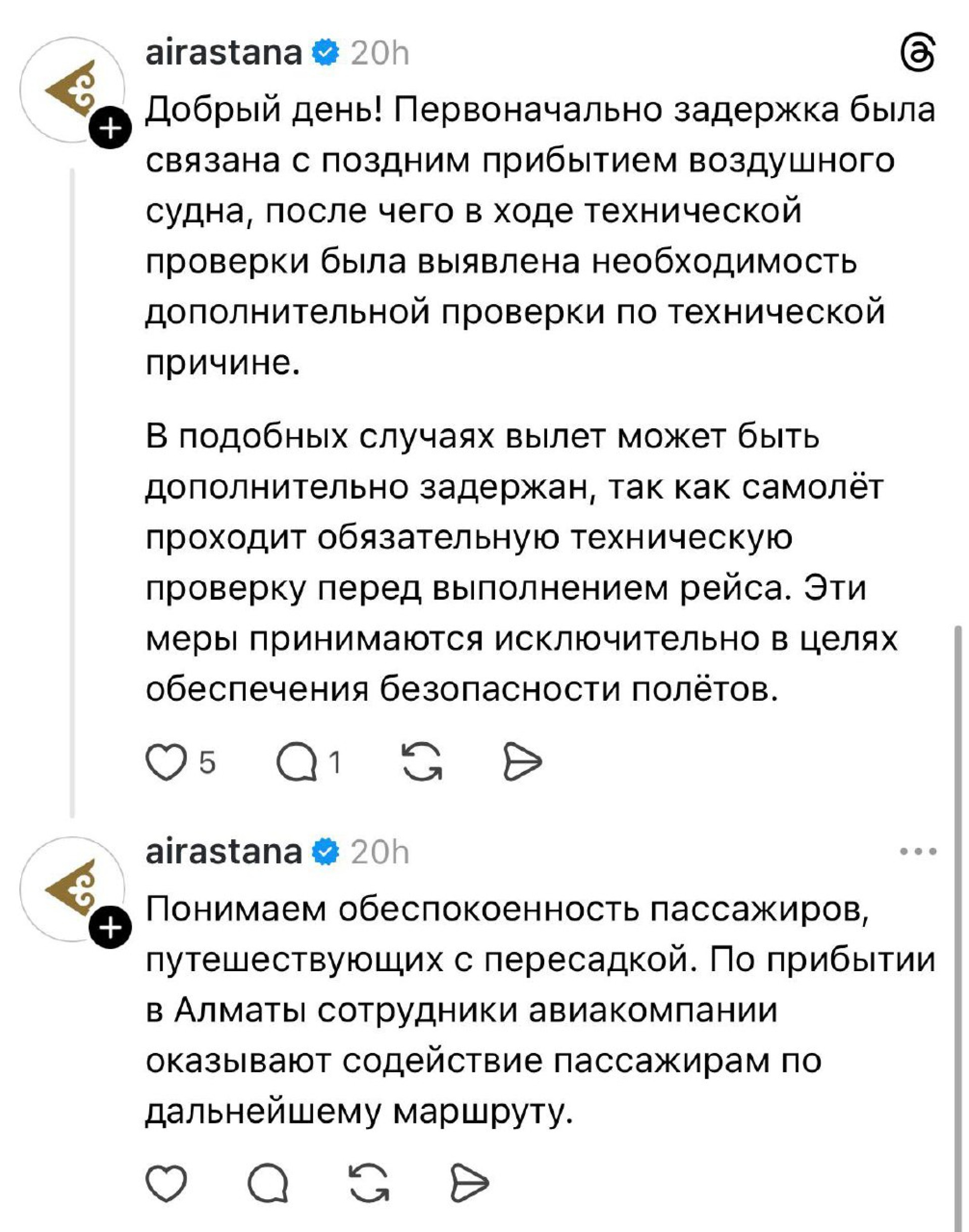 В комментариях представители Air Astana объяснили, что причины задержки менялись по мере получения новой информации.
