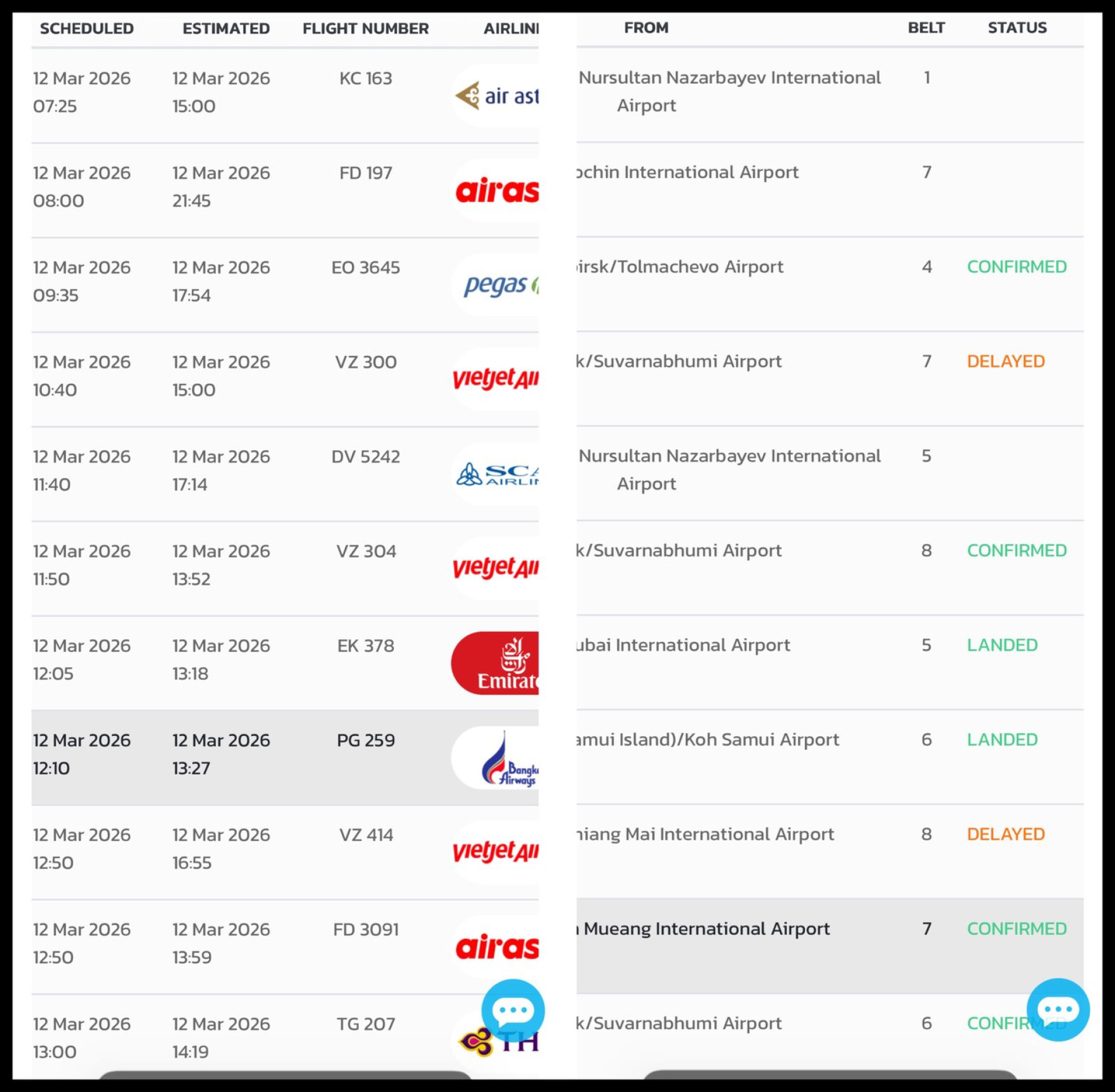 Скриншот: онлайн-табло аэропорта Пхукета на прилет