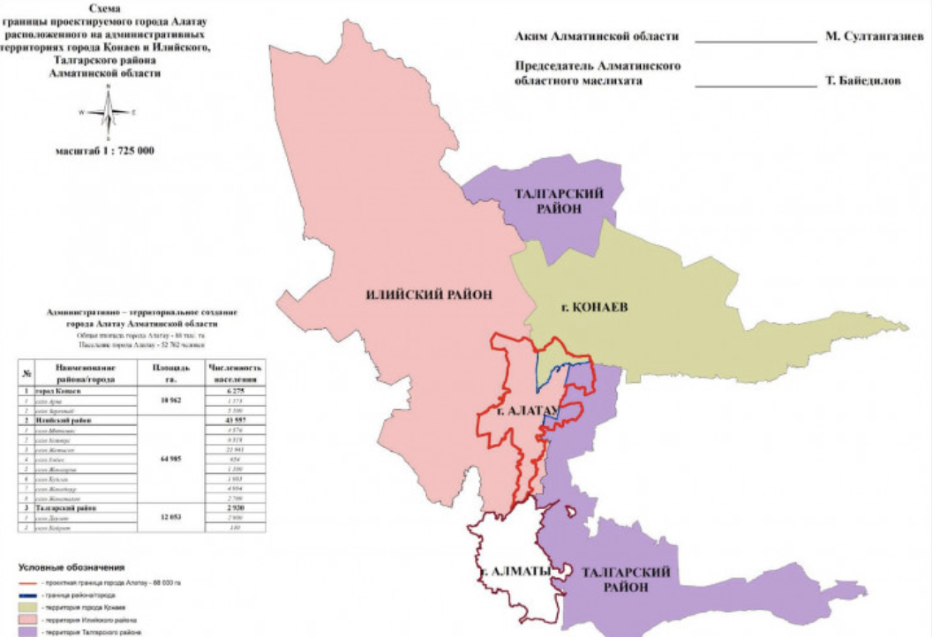 Город Алатау был основан в 2024 году на базе села Жетыген. В результате изменения границ Илийского и Талгарского районов, а также города Конаева, часть территорий вошла в состав нового города. На карте это выглядит так: