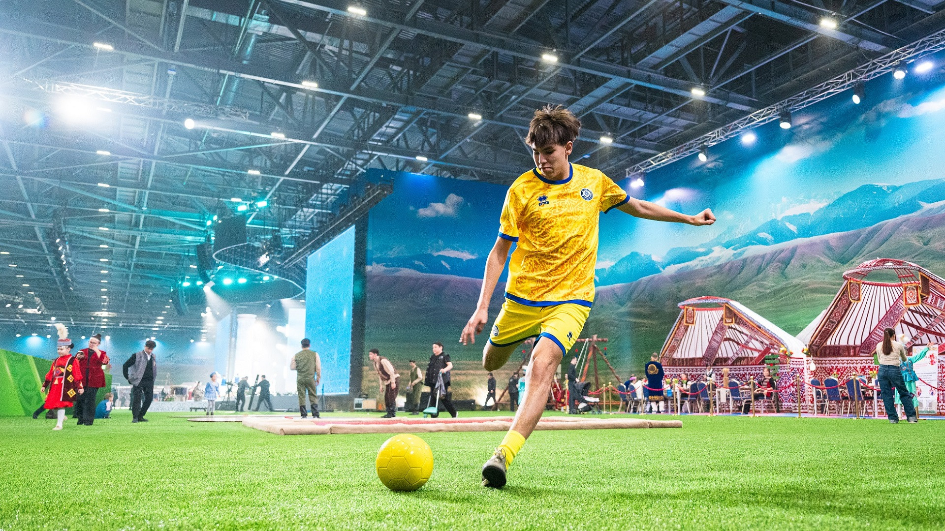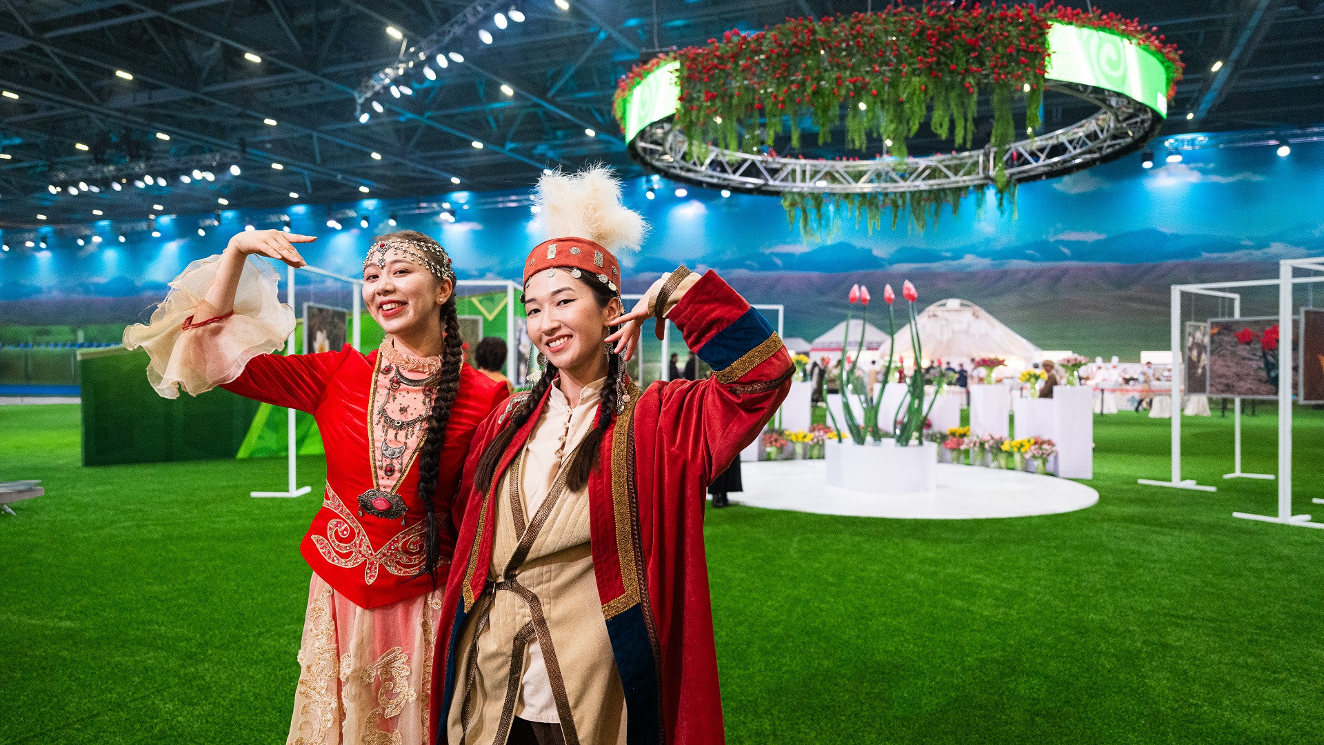В центральной части площадки установлен масштабный LED-экран, на котором изображение, созданное с помощью искусственного интеллекта, передает атмосферу традиционного казахского аула и весеннего обновления.