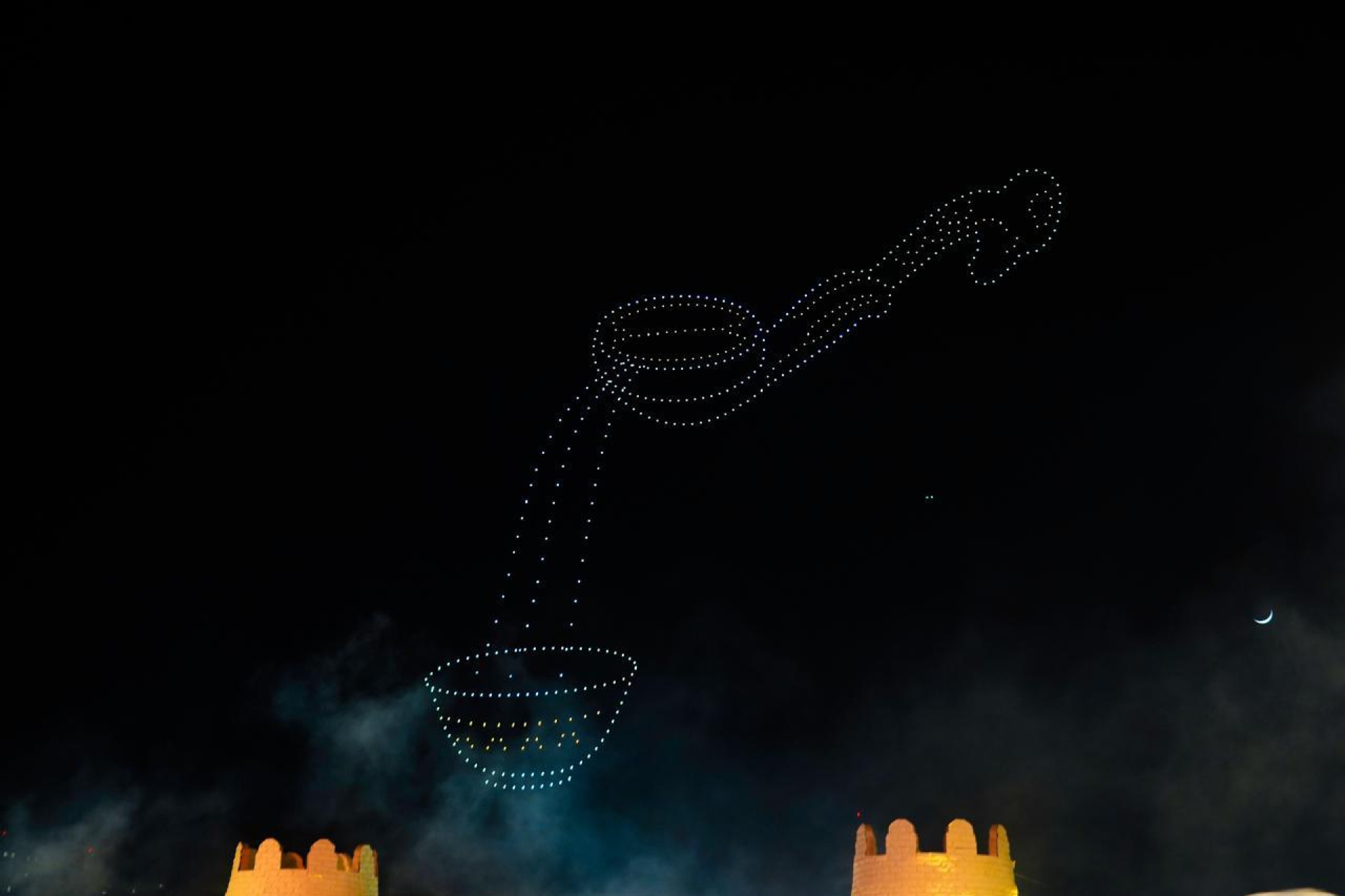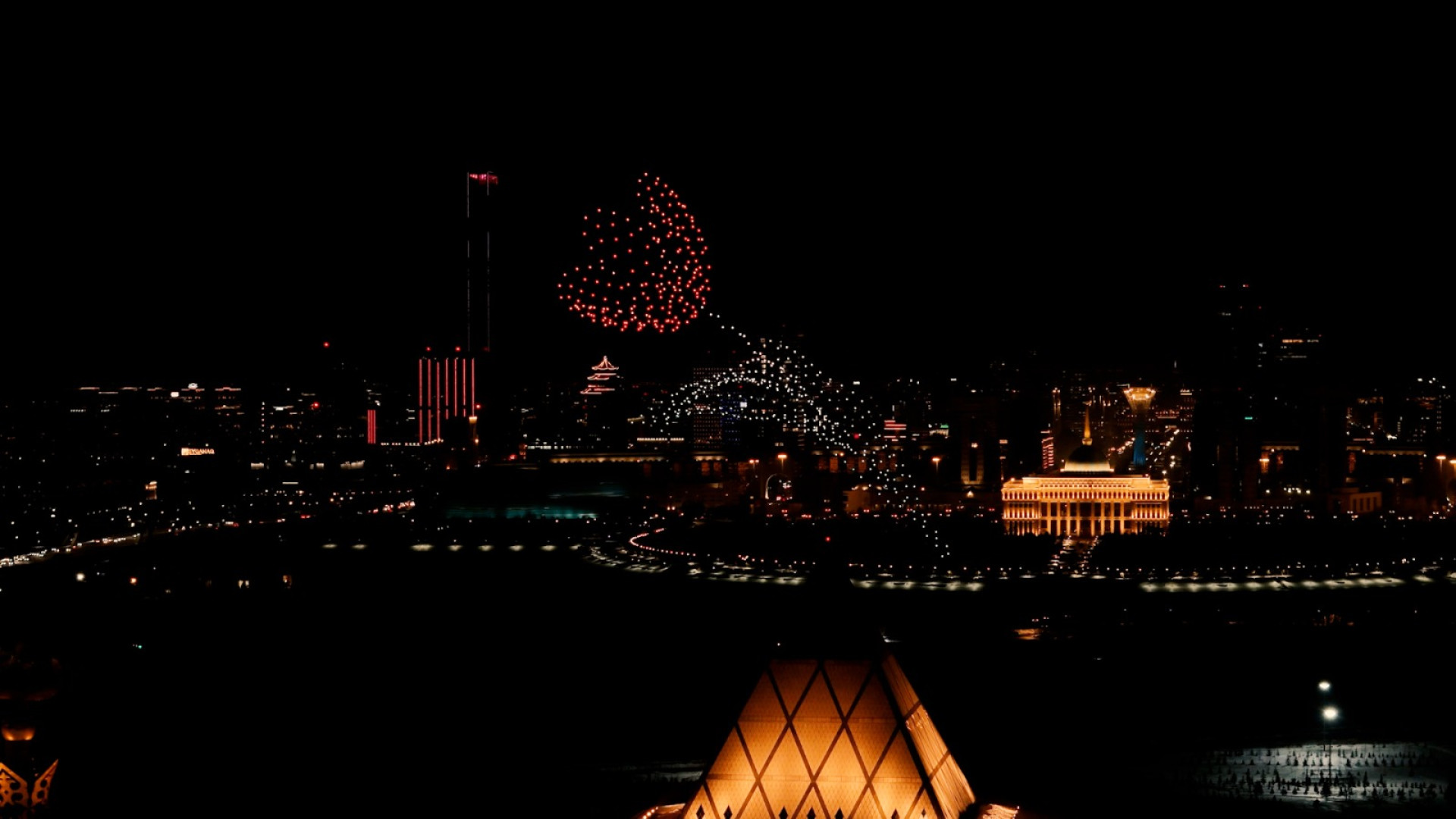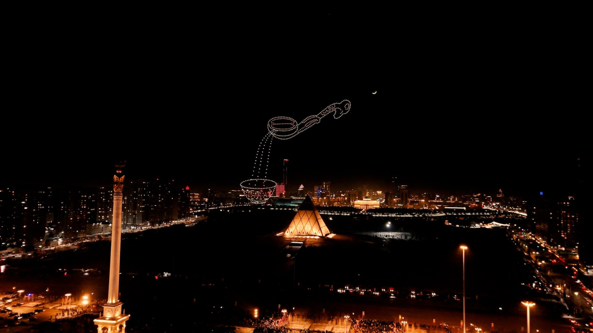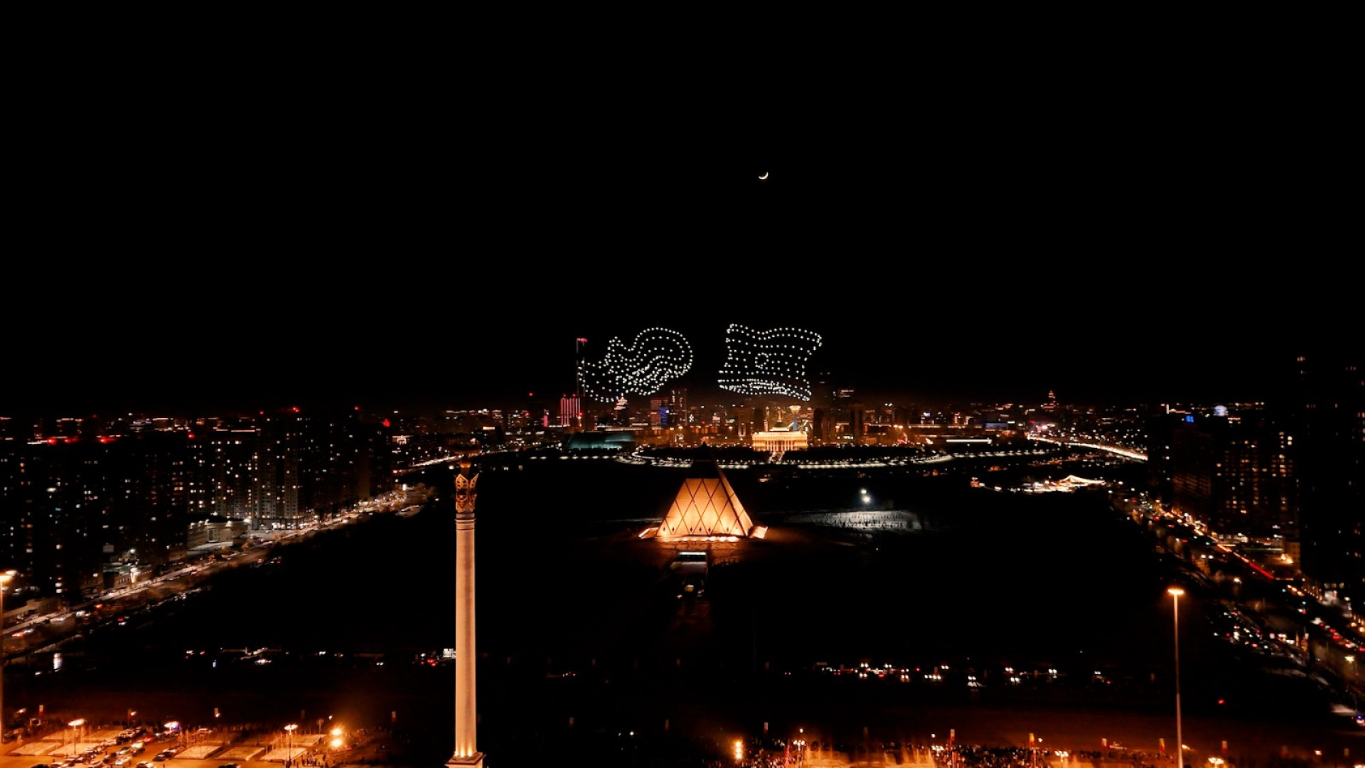 Дроны создали яркие композиции в ночном небе, демонстрируя традиционное казахское наследие. Зрителям были представлены световые инсталляции в виде: