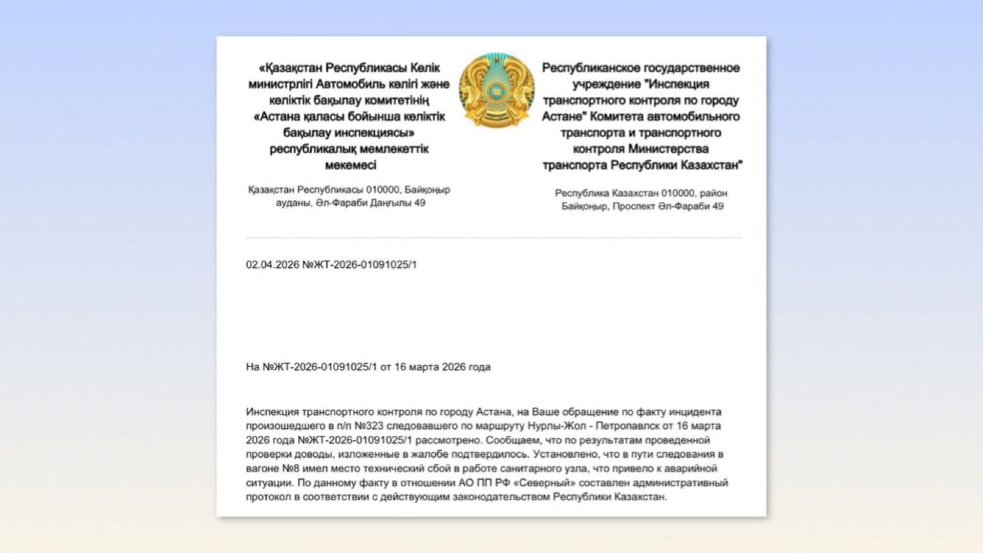 КТЖ подтвердила, что инцидент произошел в поезде №323 Астана — Петропавловск. На перегоне Тайынша – Смирново нарушение правил пользования биотуалетом привело к засору санитарно-технической системы вагона в плацкартном вагоне №8/28339.