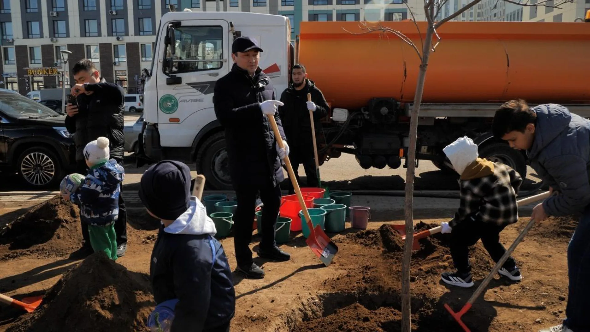 Жители ближайших домов, семьи с детьми, студенты, учителя, спортсмены и сотрудники госорганов вооружились лопатами и перчатками, чтобы очистить территорию и высадить деревья.