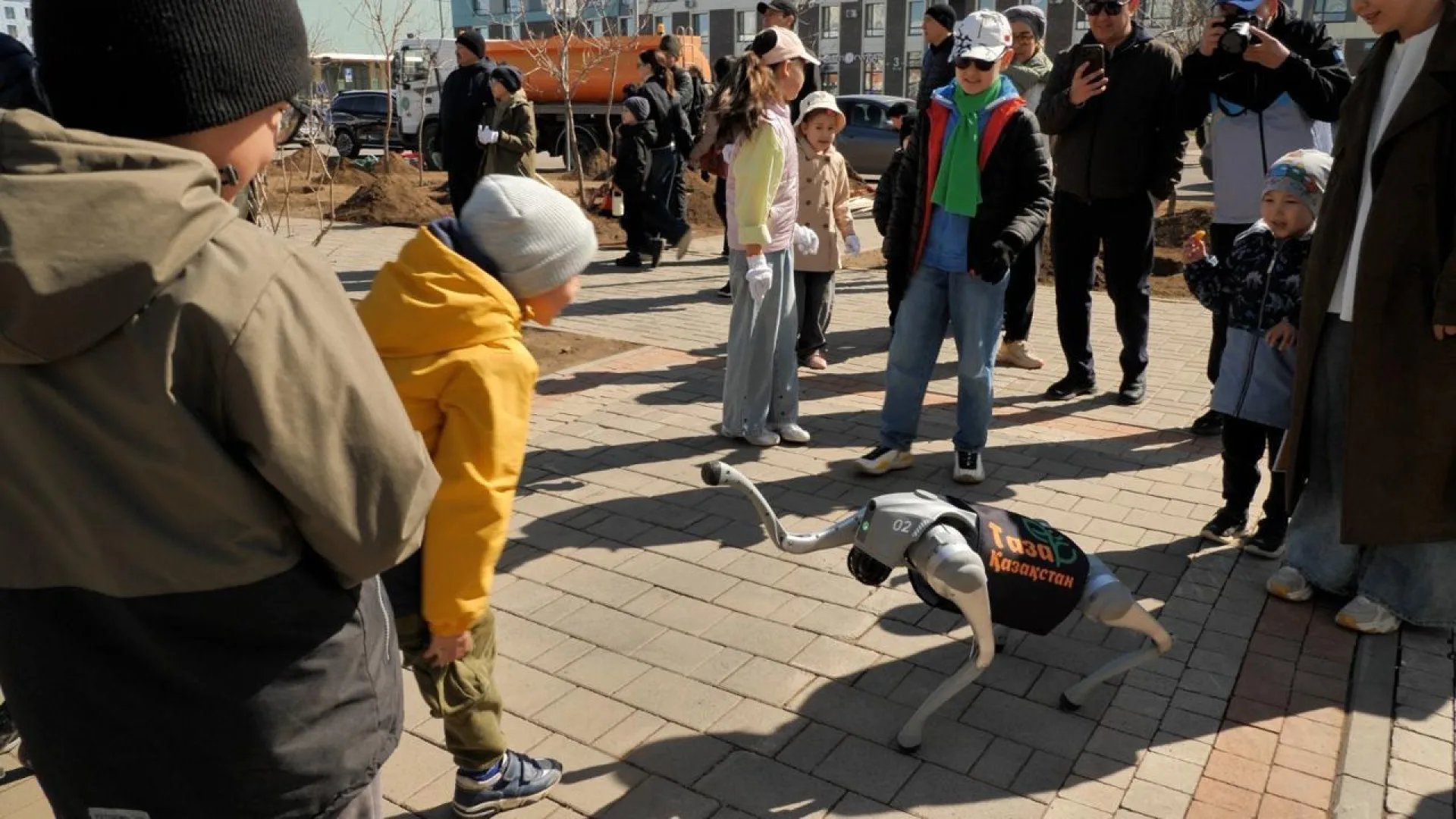 Робот-собака Теміртес привлек внимание участников, проходя между ними и реагируя на команды. Дети выстраивались в очередь, чтобы поиграть с ней.