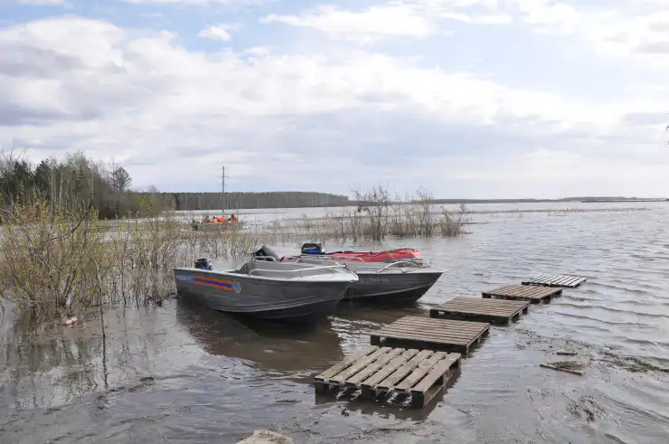 На дороге организована переправа. Сотрудники департамента по ЧС на моторных лодках перевозят жителей между селом и "большой землёй".