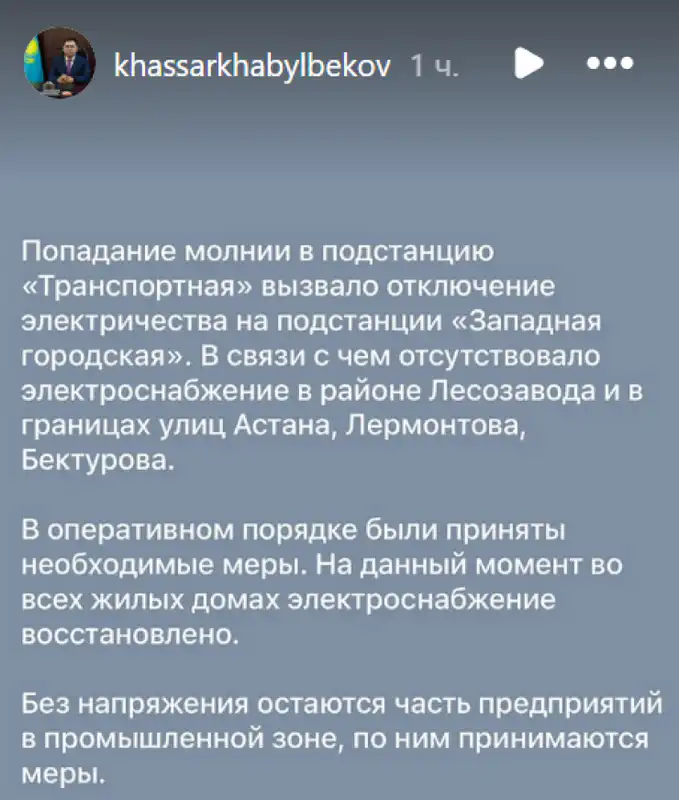 «Попадание молнии в подстанцию "Транспортная" вызвало отключение электричества на подстанции "Западная городская". В связи с чем отсутствовало электроснабжение в районе Лесозавода и в границах улиц Астана, Лермонтова, Бектурова», - написал он.