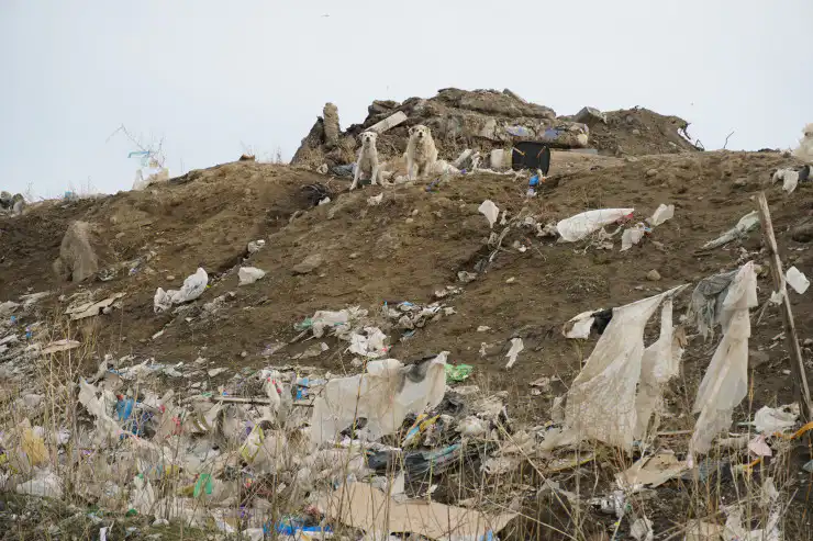 Полигон стал домом для бродячих собак, которые ищут пищу среди мусора.