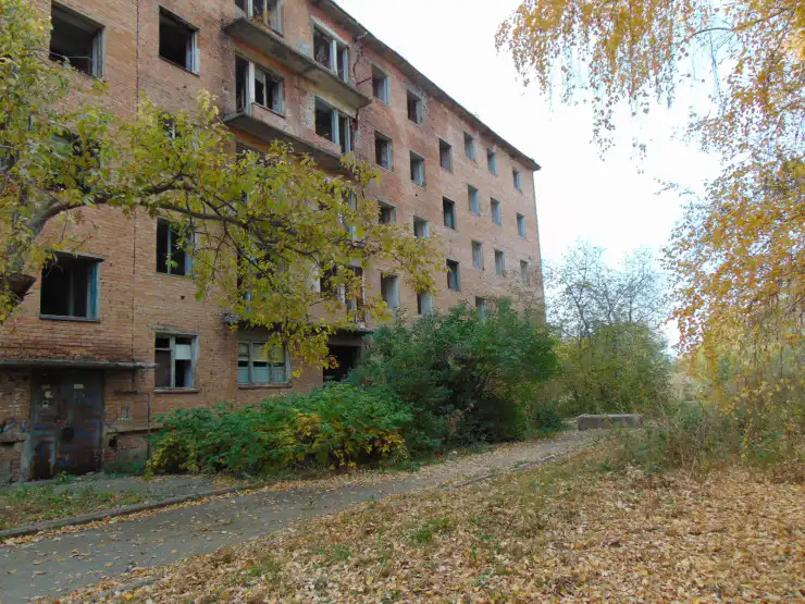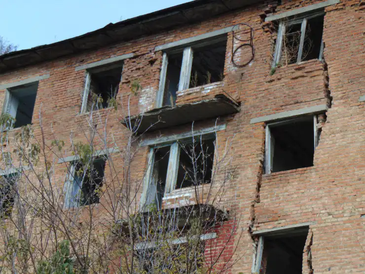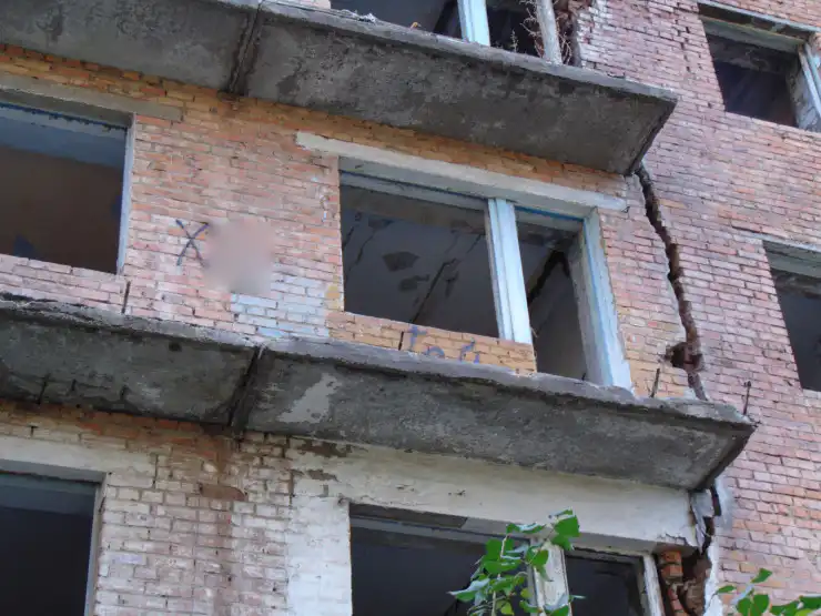 Дом №7 по улице Юбилейной выглядит угрожающе: большая трещина проходит от крыши до фундамента, балконы находятся в запущенном состоянии, окна выбиты, а подъезды зарастают бурьяном. Местные жители называют его "домом-призраком".