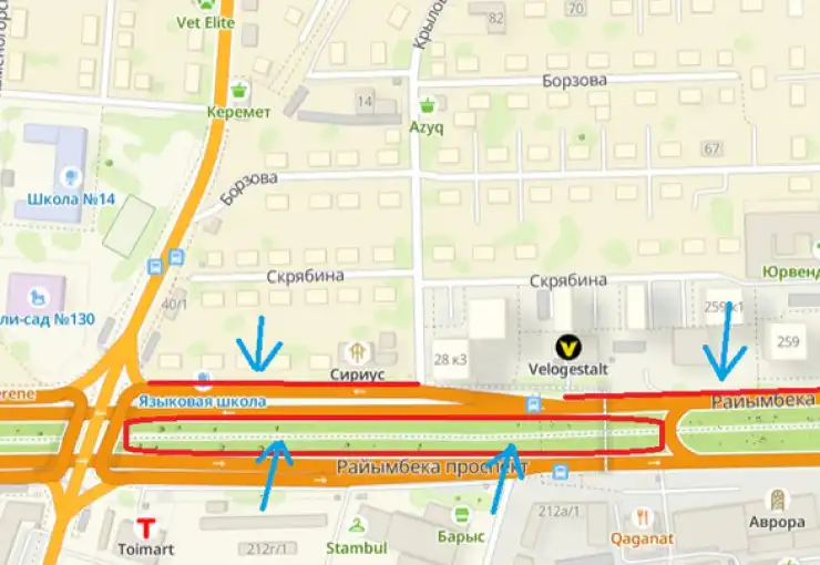- от моста по улице Розыбакиева до улицы Тургута Озала, а также область от Брусиловского до Тлендиева;
