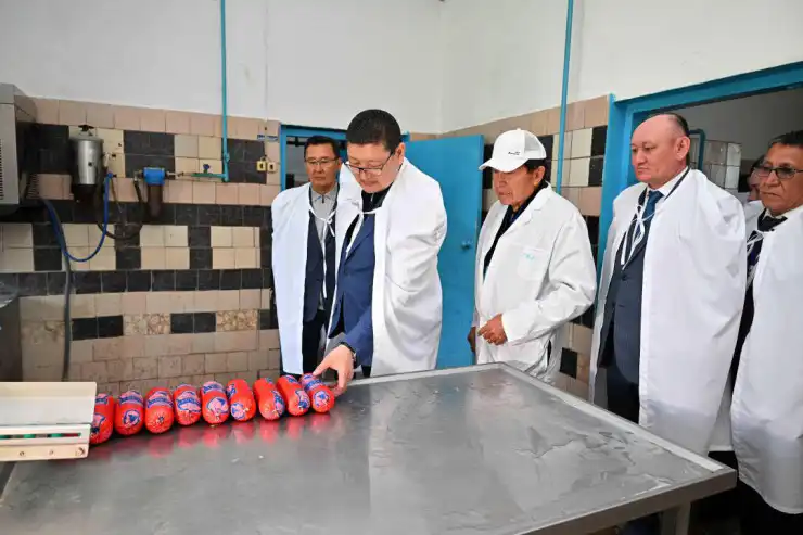 Далее Уали посетил производственные комплексы еще одного хозяйства, где лично потрогал производимую рабочими колбасу.