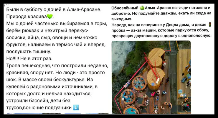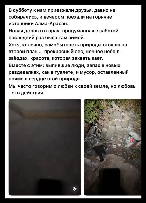 Одной из посетительниц Алма-Арасана удалось поделиться своими впечатлениями в соцсетях. Она отметила, что, несмотря на живописные горные пейзажи и новую дорогу, отдых был испорчен мусором, неприятным запахом в раздевалках и шумными компаниями. "В субботу к нам приезжали друзья, мы давно не собирались, вечером отправились на горячие источники Алма-Арасан. Новая дорога в горах продумана с заботой. Последний раз я была там зимой. Но, к сожалению, самобытная красота природы отошла на второй план - прекрасный лес, ночное небо в звёздах. Вместе с этим - выпившие люди, запах в новых раздевалках, как в туалете, и мусор, оставленный прямо в сердце этой природы. Мы часто говорим о любви к своей земле, но любовь - это действия", - написала она.