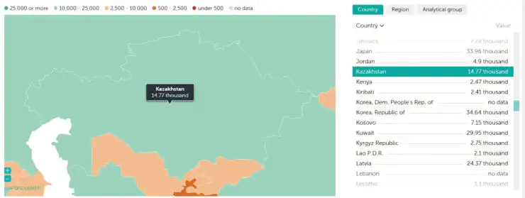 Согласно обновленным данным Международного валютного фонда (МВФ) на апрель 2025 года, уровень ВВП Казахстана на душу населения составил 14,77 тысячи долларов.