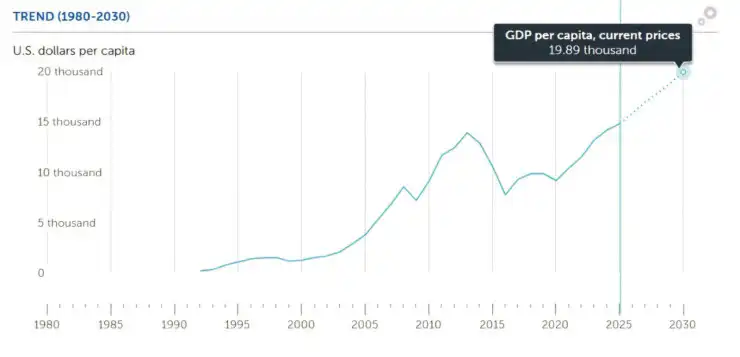 МВФ ожидает дальнейшего роста этого показателя. К 2030 году уровень ВВП на душу населения может достичь 19,89 тысячи долларов.
