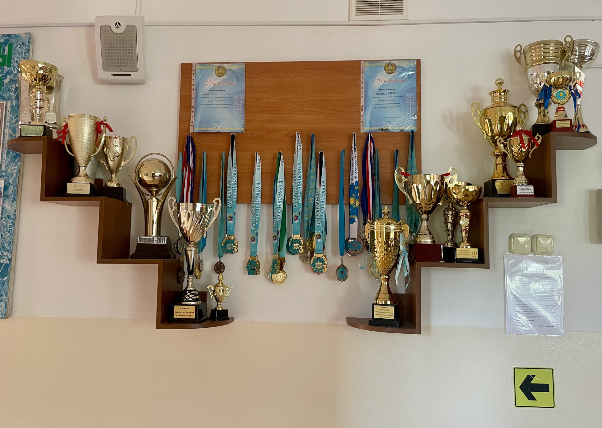 Полка с медалями и кубками, выигранными учениками школы на районных и областных спортивных соревнованиях.