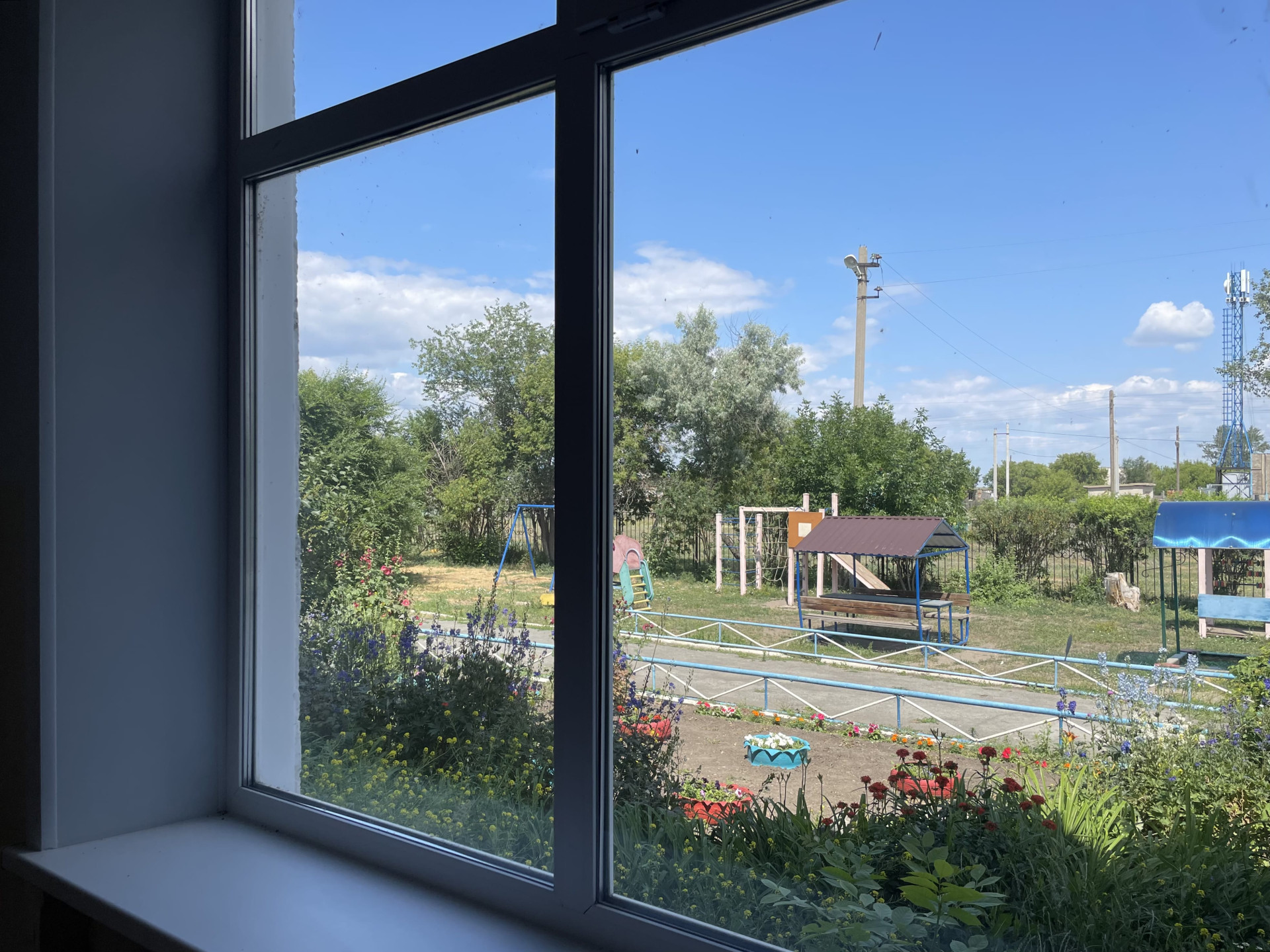 Вид из окна на двор школы.