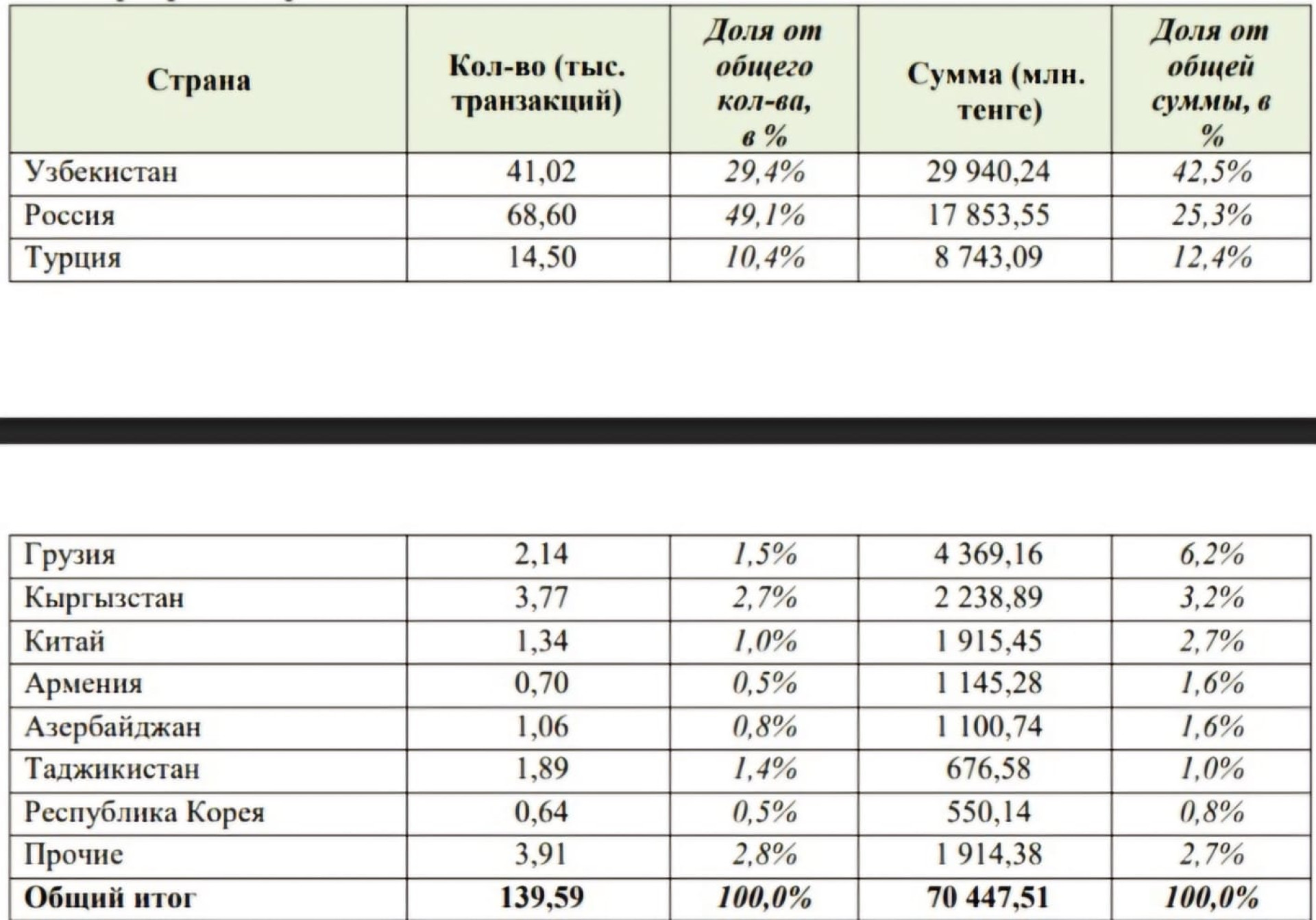 - Узбекистан – 29,9 миллиарда тенге (доля от общей суммы - 42,5 процента);