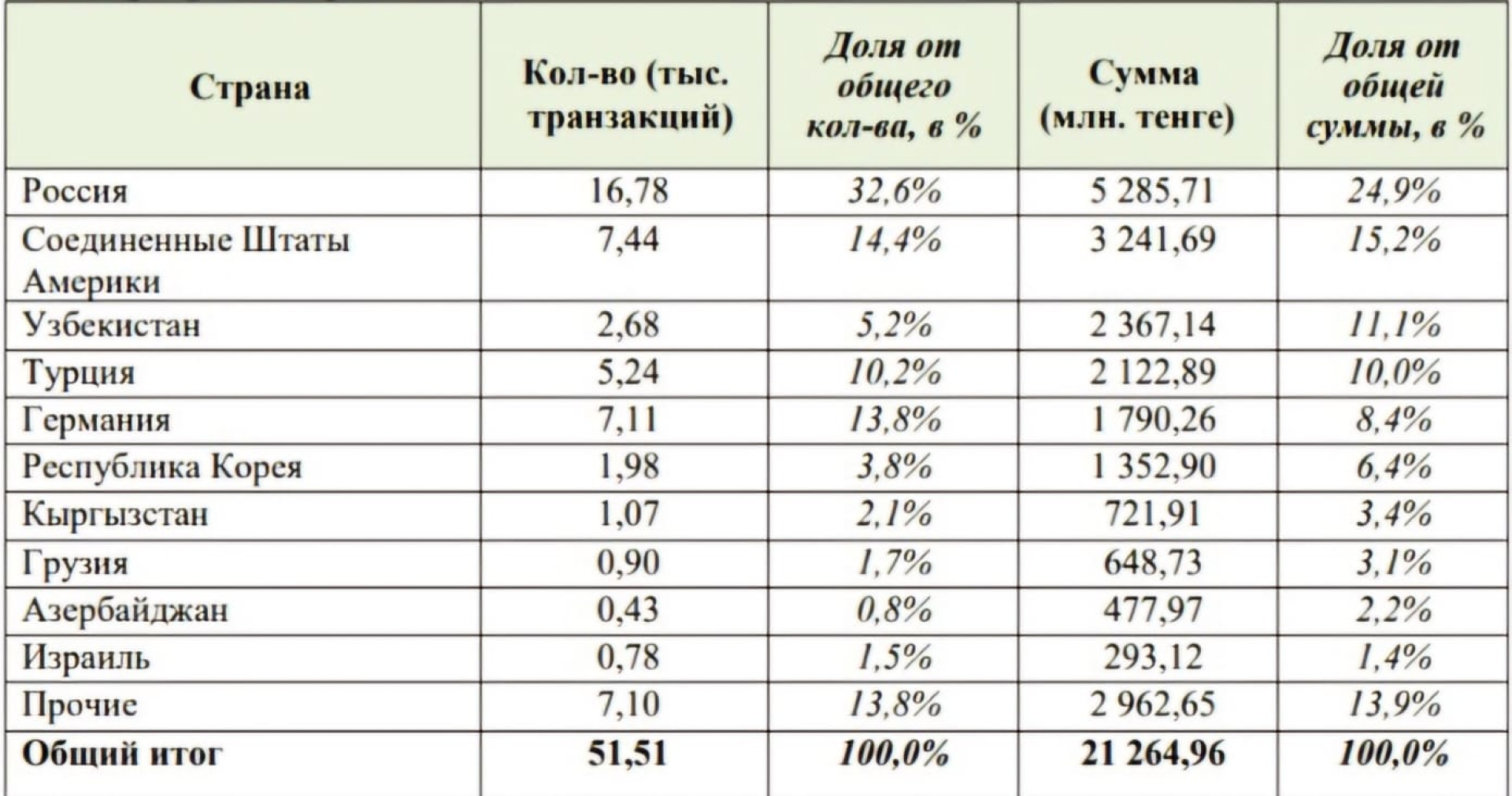 - Россия – 5,3 миллиарда тенге (доля от общей суммы - 24,9 процента);