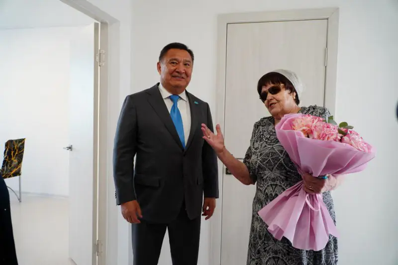 Ахметжанов также вручил ключи от новых квартир 107 семьям, переселённым из ветхого жилья, и подарил женщинам цветы.