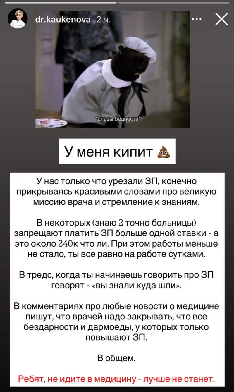 "В комментариях про любые новости о медицине пишут, что врачей надо закрывать, что все бездарности и дармоеды, у которых только повышают зарплаты. В общем, ребята, не идите в медицину," — написала она.