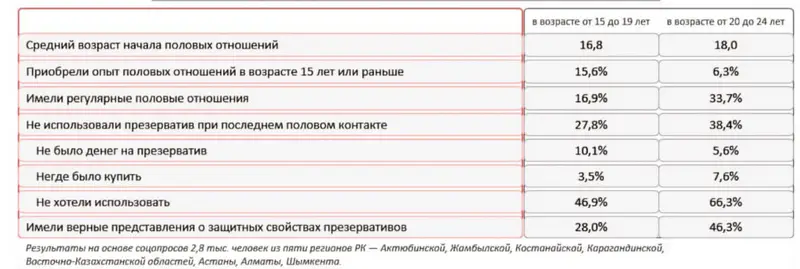 Эксперты провели опрос среди подростков в Казахстане, в котором приняли участие 2,8 тысячи респондентов из городов Астана, Алматы и Шымкент, а также Актюбинской, Жамбылской, Костанайской, Карагандинской и Восточно-Казахстанской областей. Опрос охватывал подростков в возрасте от 15 до 24 лет и выявил ряд интересных фактов о половой жизни молодежи.